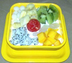 西米50克、櫻桃5克、木瓜5克、菠蘿5克、椰肉5克、奇異果5克、植物淡奶30克、西瓜60克