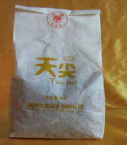 天尖外形條索緊結,較圓直,嫩度較好,色澤烏黑油潤。香氣醇和帶松煙香,湯色橙黃,滋味醇厚,葉底黃褐尚嫩。古時以100-50斤為規格,為適應市場化現有兩公斤、一公斤、和一斤等規格。